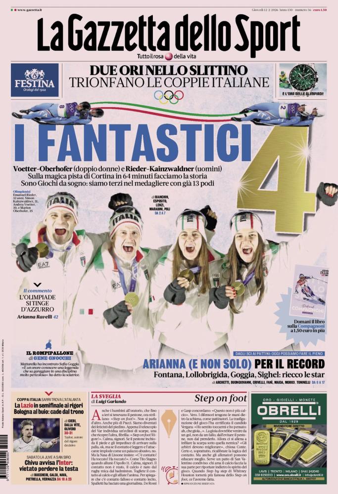 OLIMPIADI: TRIONFO STORICO - Due ori nello slittino trionfano le coppie italiane - L'apertura celebra una giornata leggendaria a Milano-Cortina. I Fantastici 4 - Voetter-Oberhofer (doppio donne) e Rieder-Kainzwaldner (uomini) vincono l'oro sulla magica pista di Cortina in 64 minuti. L'Italia sale a 13 podi ed è terza nel medagliere. Oggi si punta al record con Goggia, Brignone, Fontana e Lollobrigida.