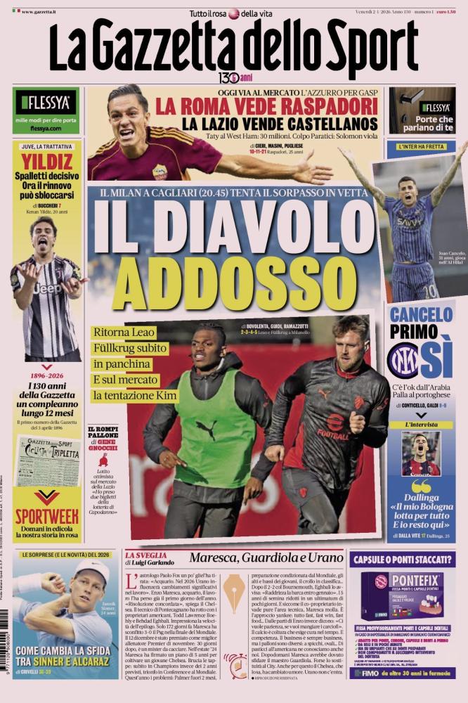MILAN: TENTATIVO DI SORPASSO - L'apertura è dedicata all'anticipo di campionato dei rossoneri a Cagliari (ore 20.45). Il titolo «IL DIAVOLO ADDOSSO» sottolinea l'ambizione della squadra che tenta il sorpasso in vetta alla classifica. - Le scelte di formazione: torna Rafa Leao dal primo minuto, mentre il nuovo acquisto Niclas Füllkrug parte dalla panchina. Sul mercato c'è la tentazione Kim per la difesa.