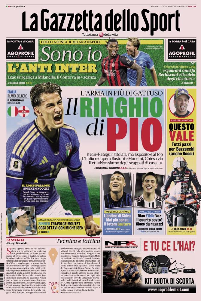 IN PRIMO PIANO E NAZIONALE - L'arma in più di Gattuso: Il ringhio di Pio. Kean-Retegui i titolari, ma Esposito è al top. L'Italia recupera Bastoni e Mancini, Chiesa via. Il ct: «Non siamo degli scappati di casa...» in vista del playoff mondiale a Bergamo contro l'Irlanda del Nord.