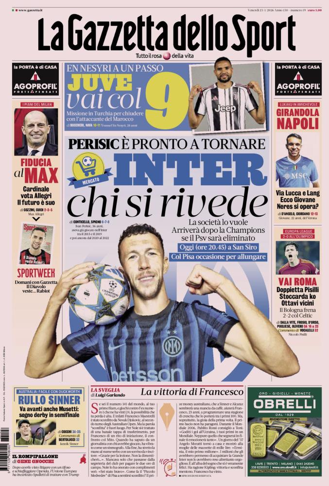 INTER: RITORNO A SORPRESA - L'apertura annuncia una clamorosa operazione di mercato dei nerazzurri. INTER chi si rivede - Ivan Perisic è pronto a tornare. La società lo vuole e l'affare potrebbe concretizzarsi dopo la Champions League, a patto che il Psv venga eliminato. Oggi intanto sfida al Pisa (ore 20.45) per allungare in classifica.