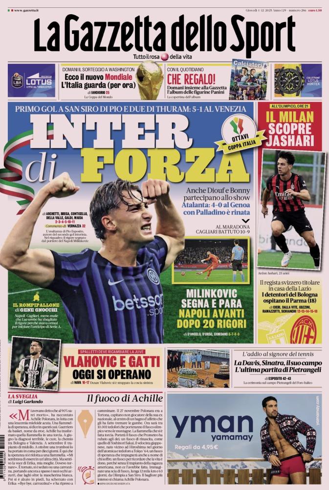 Il titolo a tutta pagina celebra la prova convincente dei nerazzurri: "INTER DI FORZA". Contro il Venezia finisce 5-1, con il primo gol di Pio Esposito e una doppietta di Thuram. In taglio alto a destra, spazio al mercato rossonero: "IL MILAN JASHARI SCOPRE". La società avrebbe individuato in Achraf Jashari (23 anni) un nuovo talento da lanciare.