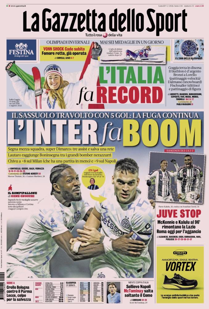 - 06:45 PRIMA PAGINA - La Gazzetta dello Sport: "L'Inter fa boom, l'Italia fa record"