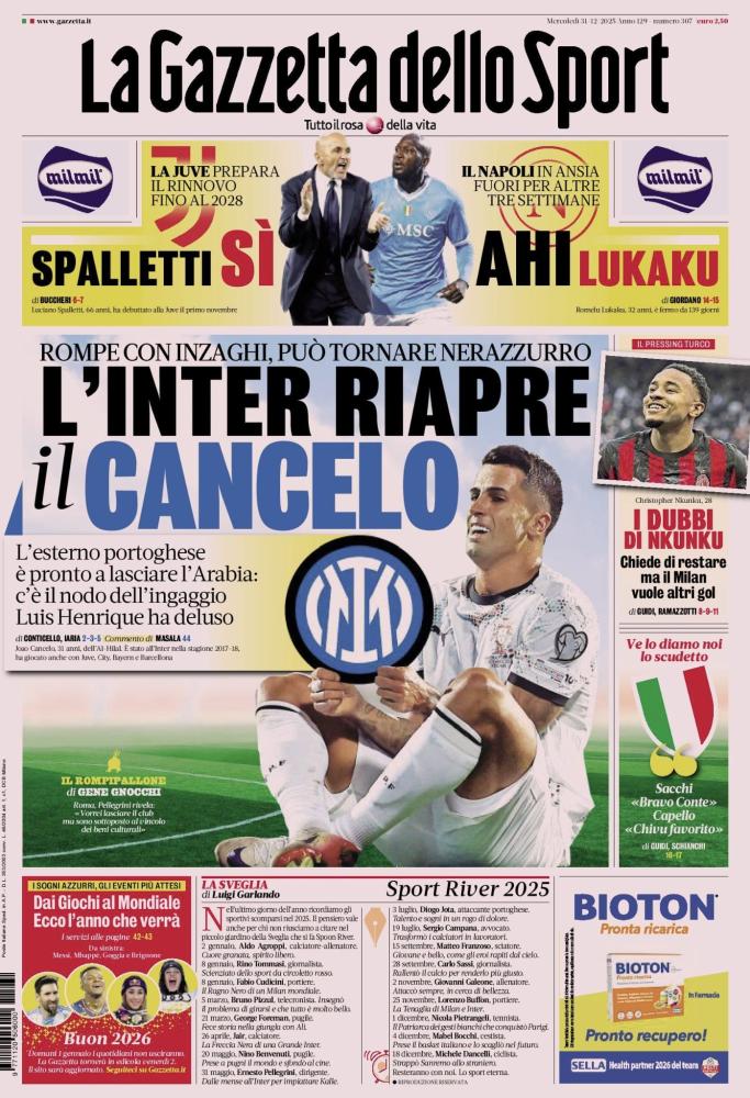 - 06:45 PRIMA PAGINA - La Gazzetta dello Sport: "L'Inter riapre il Cancelo"