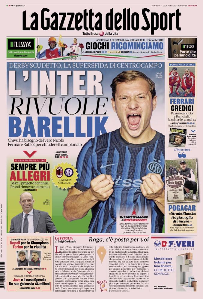 - 06:45 PRIMA PAGINA - La Gazzetta dello Sport: "L'Inter rivuole Barellik"
