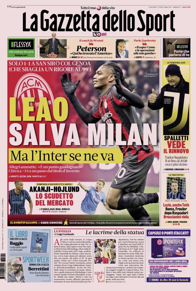MILAN: PAREGGIO COL BRIVIDO - L'apertura racconta il rocambolesco anticipo di San Siro. Il titolo «LEAO SALVA MILAN» sintetizza l'1-1 contro il Genoa. I rossoneri rischiano il ko totale: il Genoa «SBAGLIA UN RIGORE AL 99'». Rafa Leao segna il gol del pareggio al 92' (dopo il vantaggio ligure, ndr). Massimiliano Allegri ammette le difficoltà: «È un punto guadagnato». Il passo falso ha conseguenze pesanti in classifica: «Ma l'Inter se ne va». La squadra di Cristian Chivu è ora a +3 e "a un passo dal titolo d'inverno".