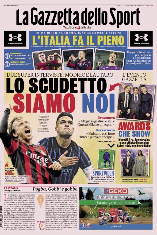 L'apertura è dedicata a un doppio confronto esclusivo tra i leader delle milanesi, sotto il titolo trionfale «LO SCUDETTO SIAMO NOI». Da una parte Luka Modric, definito "Il rossonero", elogia il tecnico: «Allegri sa gestire le stelle. Questo Milan è un sogno». Dall'altra Lautaro Martinez, "Il nerazzurro", risponde con forza: «Mai stato così forte. L'Inter è piena di energia». Un duello a distanza che accende la corsa al titolo.