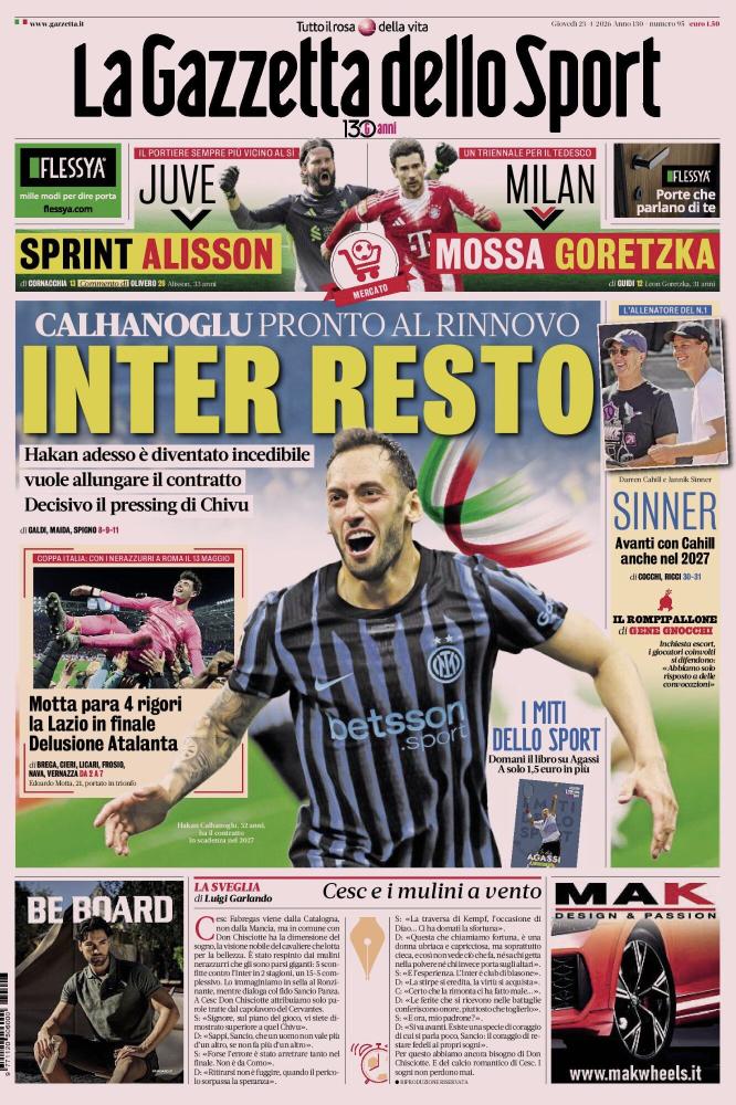 - 06:45 PRIMA PAGINA - La Gazzetta dello Sport: "Motta para 4 rigori, la Lazio in finale. Delusione Atalanta"
