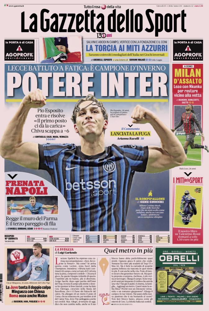 INTER: FUGA SCUDETTO - L'apertura celebra il primato nerazzurro al giro di boa. «POTERE INTER». La squadra di Cristian Chivu batte il Lecce a fatica (1-0) e si laurea «campione d'inverno». Decide il giovane Pio Esposito che "entra e risolve": «Il primo posto ci dà la carica». I nerazzurri scappano a +6 sulle inseguitrici.