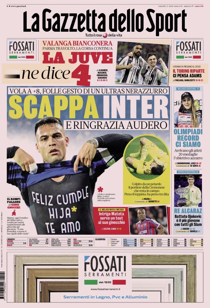 Scappa Inter e ringrazia Audero - I nerazzurri vincono a Cremona (0-2) e volano a +8 in classifica. La partita è segnata da un episodio grave: «Folle gesto di un ultras nerazzurro». Il portiere della Cremonese, Audero, viene colpito da un petardo ma resta in campo permettendo la conclusione del match. Il responsabile è stato preso: «ha perso tre dita». In campo Lautaro festeggia con una dedica speciale alla figlia.