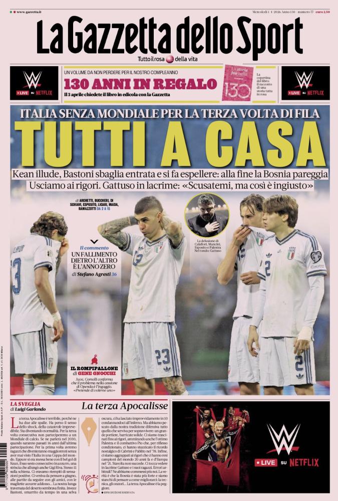 IL DRAMMA AZZURRO - Italia senza Mondiale per la terza volta di fila - Tutti a casa. Kean illude, Bastoni sbaglia entrata e si fa espellere: alla fine la Bosnia pareggia. Usciamo ai rigori. Gattuso in lacrime: «Scusatemi, ma così è ingiusto». Nella foto la delusione di Calafiori, Mancini, Esposito e Palestra.