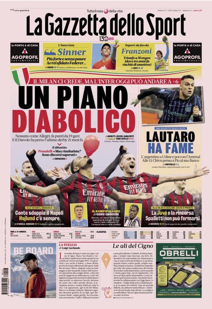MILAN: LA RINCORSA DI ALLEGRI - L'apertura gioca sul soprannome del club rossonero per descrivere la strategia di rimonta. Un piano diabolico - Nessuno come Massimiliano Allegri: fa punti da 19 gare consecutive. Il "Diavolo" ha perso l'ultimo derby 21 mesi fa e ora ci crede, puntando a mettere pressione ai rivali cittadini. Tuttavia, l'Inter oggi ha l'occasione di allungare.
