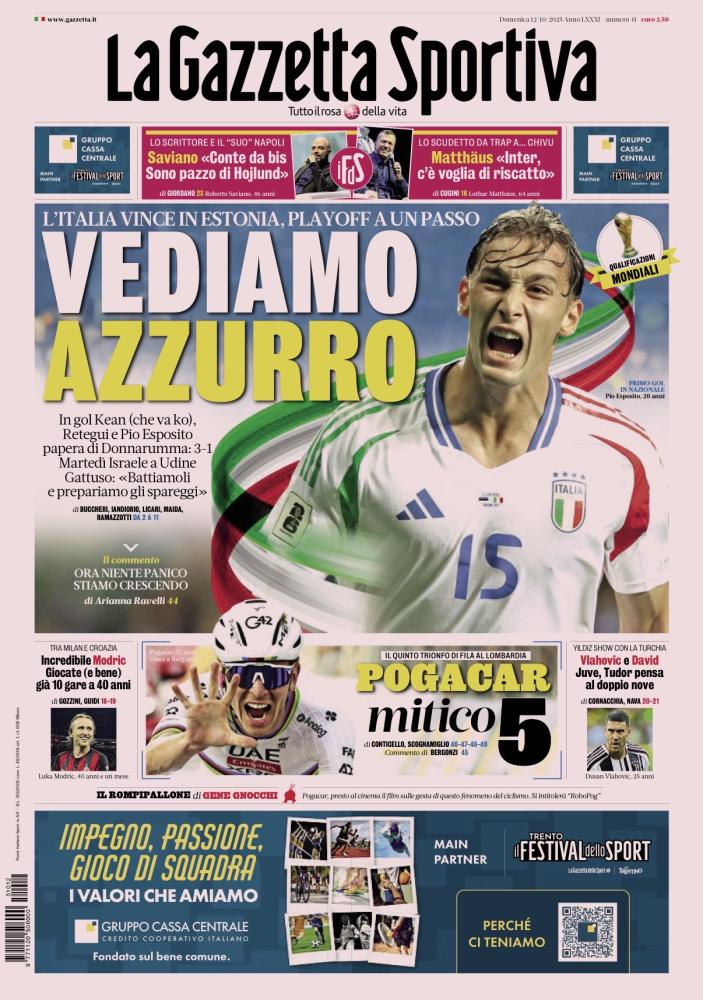 - 06:45 PRIMA PAGINA - La Gazzetta dello Sport: "Vediamo azzurro"