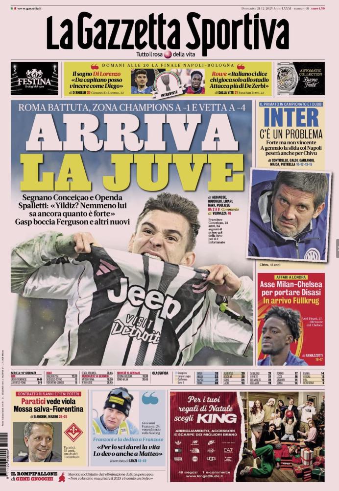 SERIE A: BIANCONERI ALLA RISCOSSA - L'apertura è dedicata al successo della Juventus che riapre i giochi per il vertice. Il titolo «ARRIVA LA JUVE» sottolinea la marcia della squadra di Spalletti: battuta la Roma 2-1, ora la zona Champions è a un punto e la vetta a quattro lunghezze. - Decidono le reti di Conceiçao e Openda. Nel post partita, Luciano Spalletti esalta il talento del suo numero 10: «Yildiz? Nemmeno lui sa ancora quanto è forte». Dall'altra parte, Gian Piero Gasperini boccia i nuovi acquisti come Ferguson.