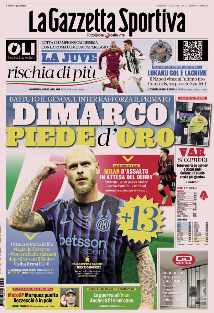 - 06:45 PRIMA PAGINA - La Gazzetta Sportiva: "Dimarco piede d'oro"