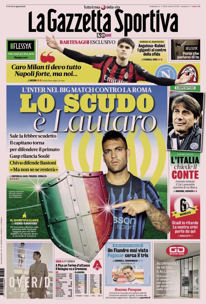 IN PRIMO PIANO - L'Inter nel big match contro la Roma: Lo scudo è Lautaro. Sale la febbre scudetto: il capitano torna per difendere il primato. Gasp rilancia Soulé. Chivu difende Bastoni: «Ma non so se resterà».