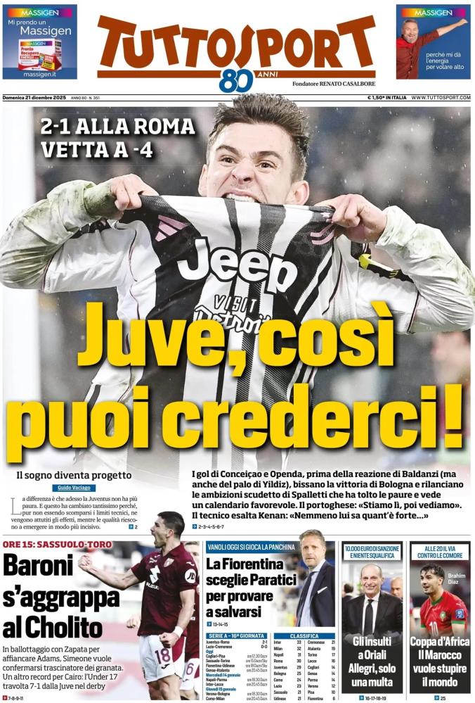 JUVE: IL SOGNO DIVENTA PROGETTO - Entusiasmo alle stelle in casa bianconera dopo il 2-1 alla Roma. Il titolo «Juve, così puoi crederci!» lancia la volata scudetto con la vetta ora distante solo 4 punti. - I gol di Conceiçao e Openda, uniti alla reazione dopo il gol di Baldanzi e il palo di Yildiz, rilanciano le ambizioni di Luciano Spalletti. Il tecnico esalta il gruppo e Kenan Yildiz: «Nemmeno lui sa quant'è forte». Il calendario ora è favorevole.